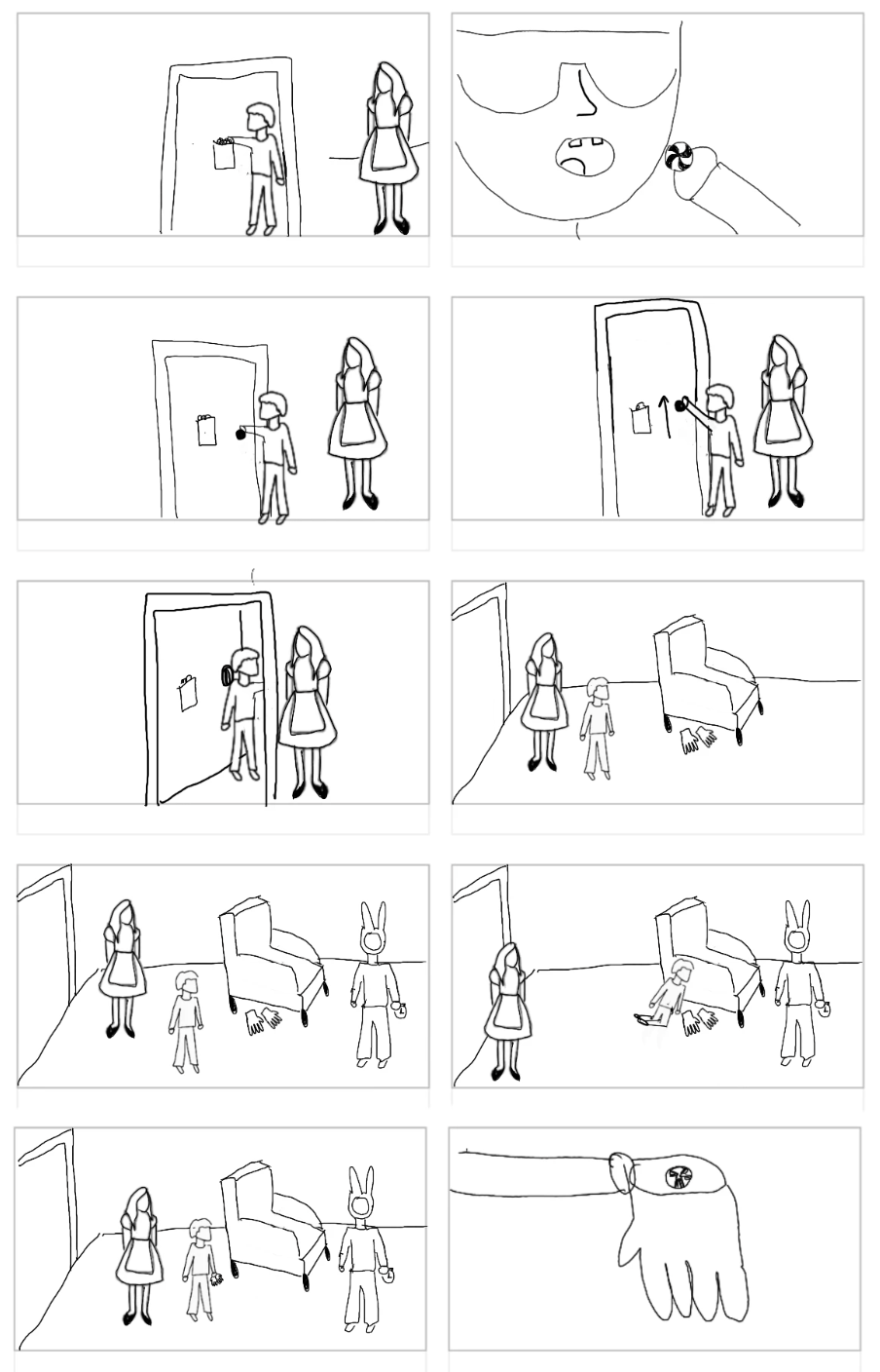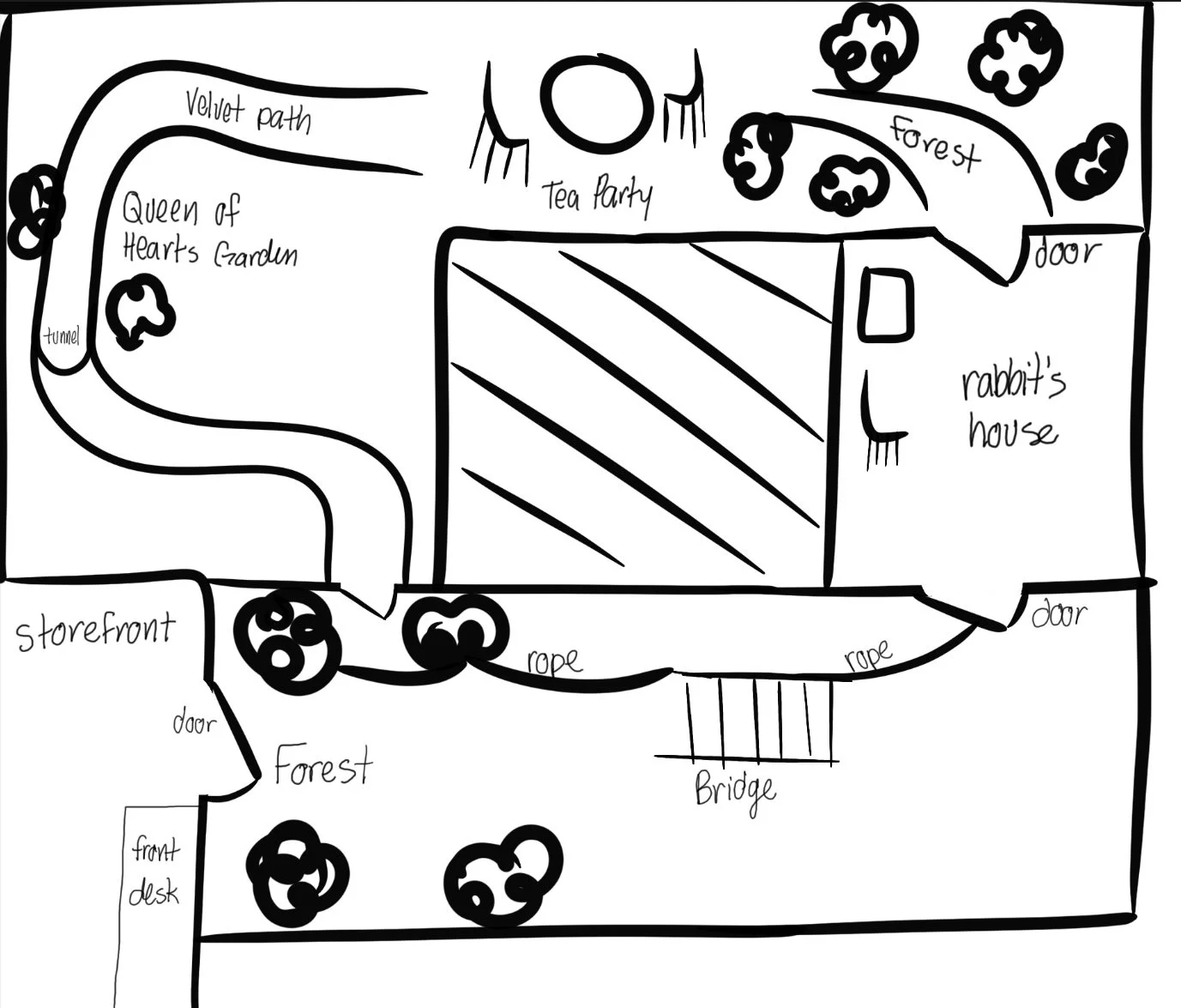 We explored a range of potential solutions, including interactive wall panels, rope-based navigation, topographical maps, and connected surfaces using varied materials to guide users through the experience. We also considered several narrative directions, such as The Gingerbread Man, Mario Party 8, and Noah’s Ark, before ultimately selecting Alice in Wonderland for its strong potential to support immersive, multisensory storytelling.